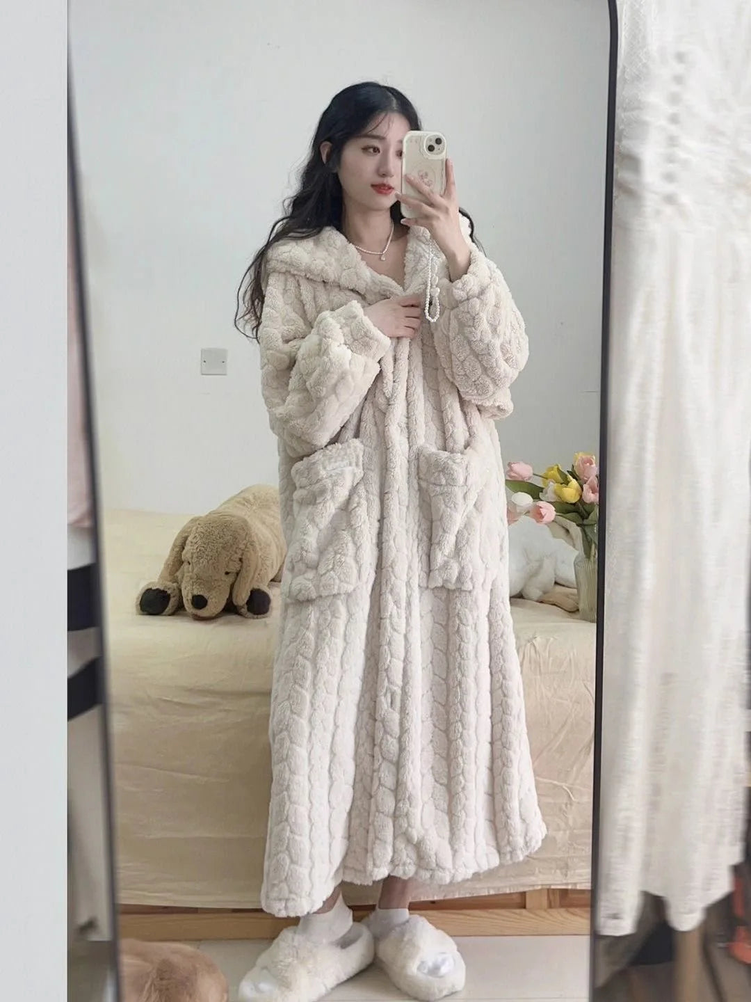 Embrace the ultimate "lazy day" luxury with this plush dressing gown from M&T Wear. Designed with a trendy Korean-style aesthetic, this thick nightwear piece is perfect for students and women who want to stay incredibly warm and cute during the coldest winter months.
