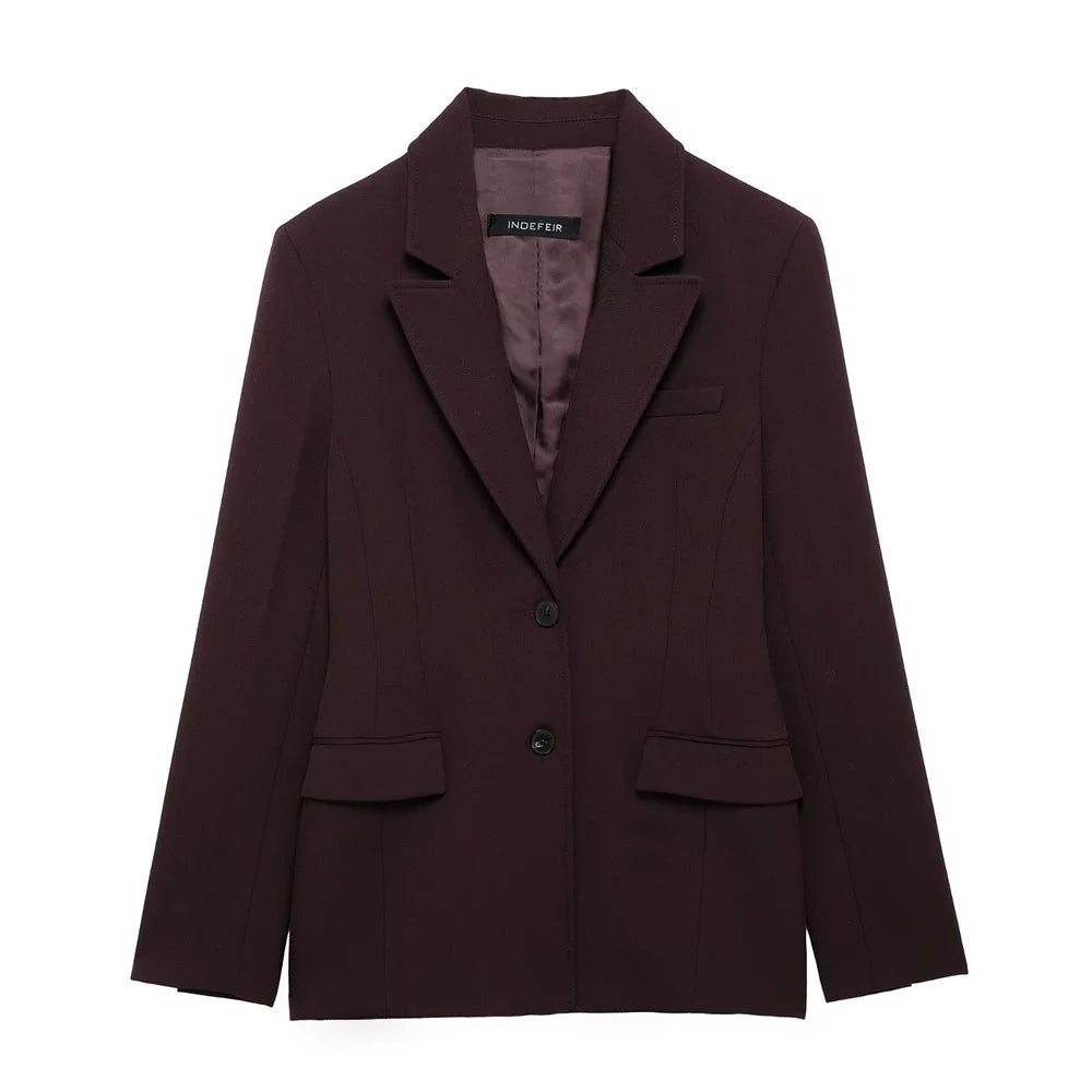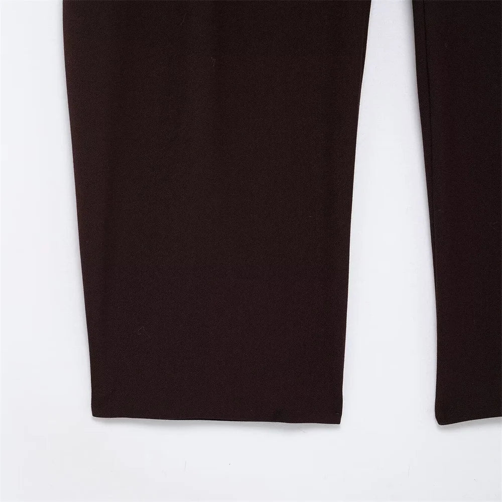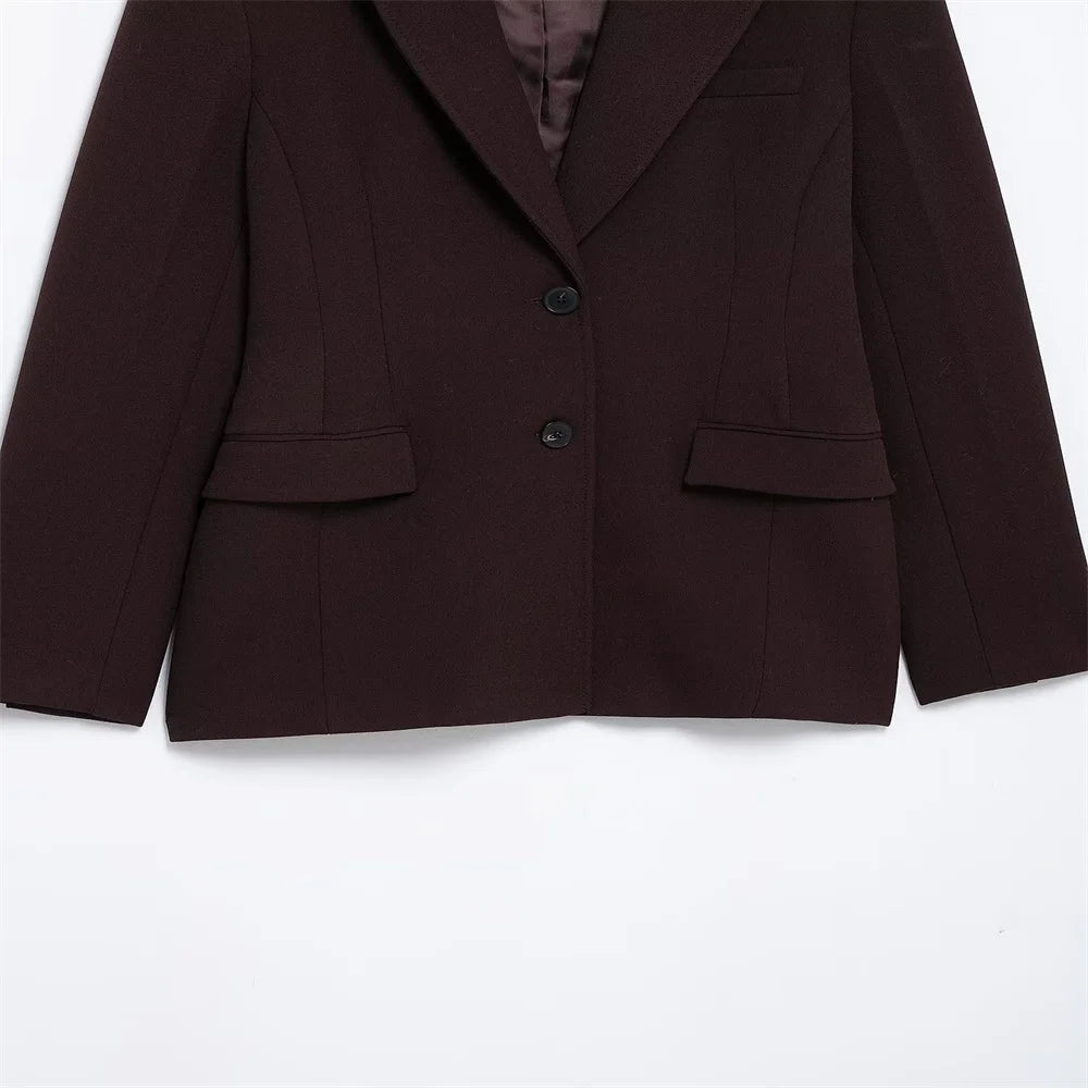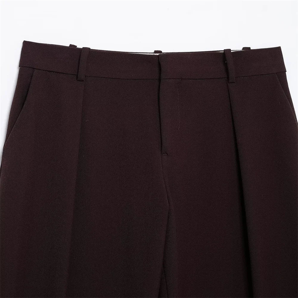 The single-breasted blazer features a classic notched collar and a loose, comfortable fit, while the matching pants offer a trending wide-leg cut with pleated front detailing. This combination creates a visually slimming effect that is both stylish and professional. Whether worn together for a powerful monochrome look or styled separately, this set is the ultimate versatile addition to your wardrobe.