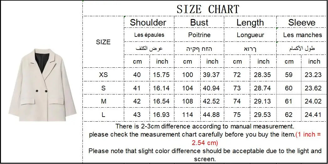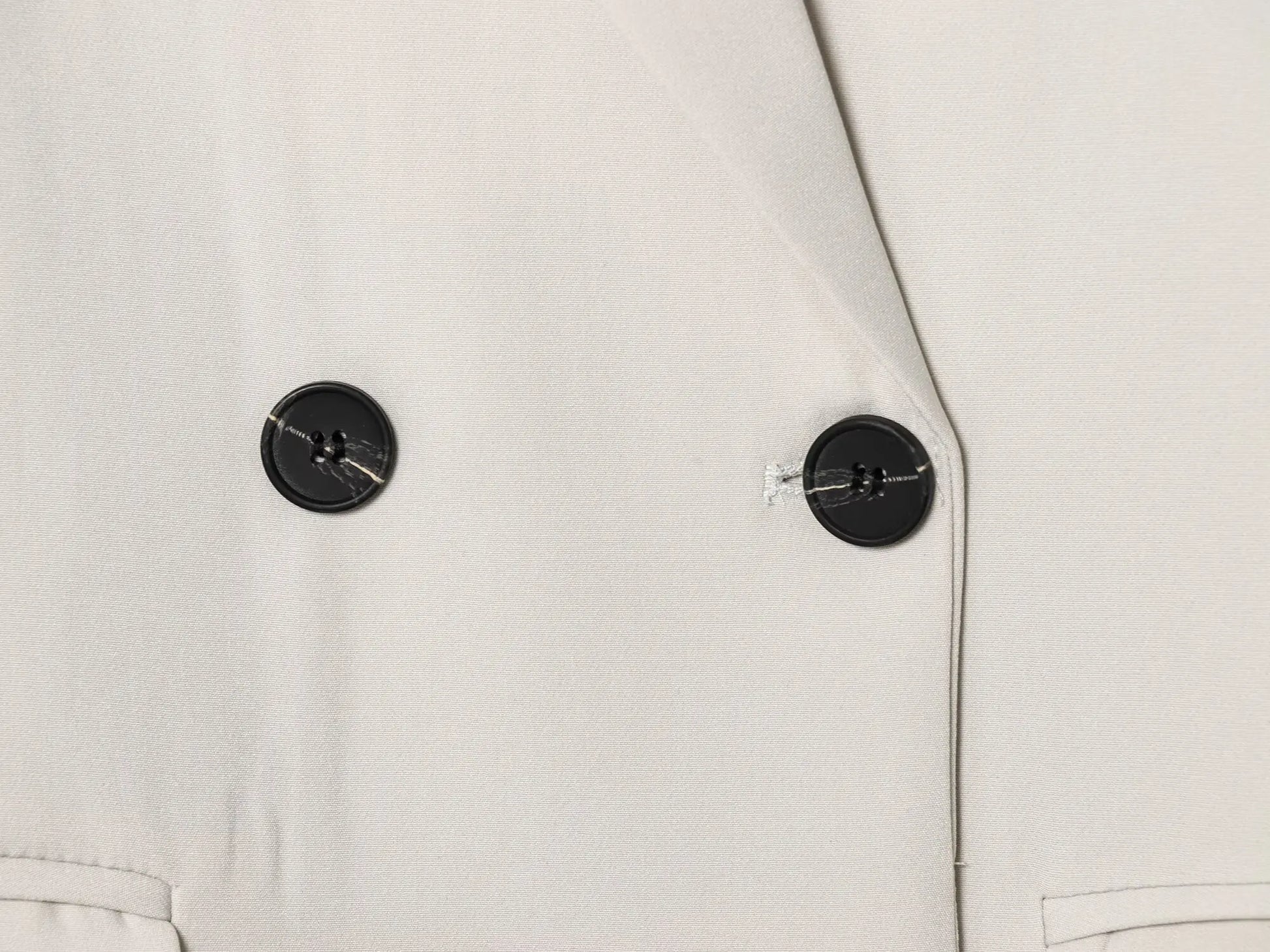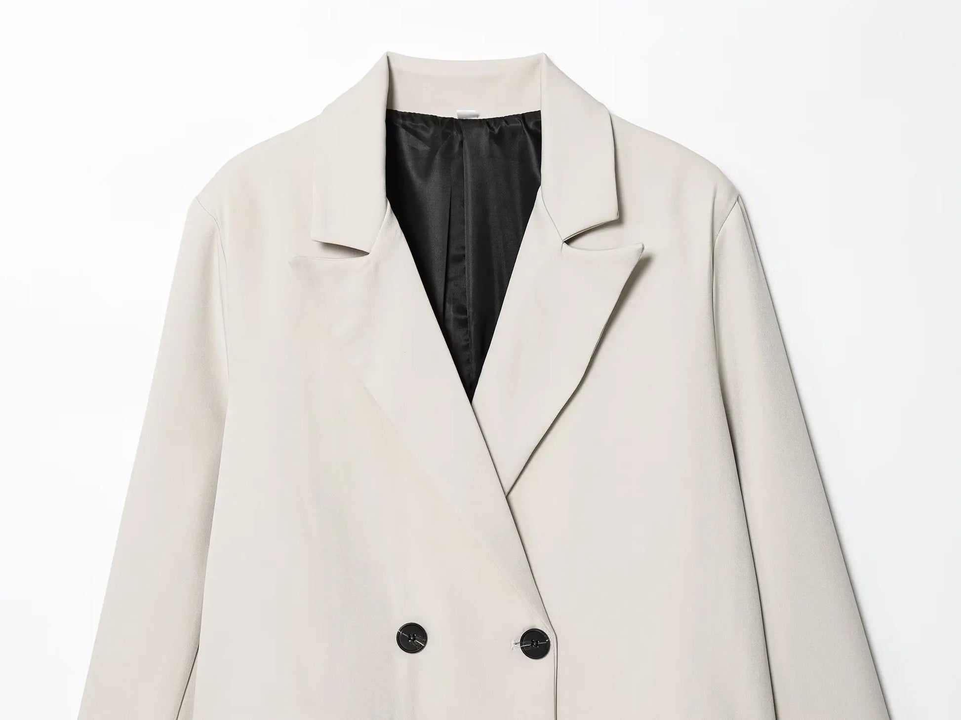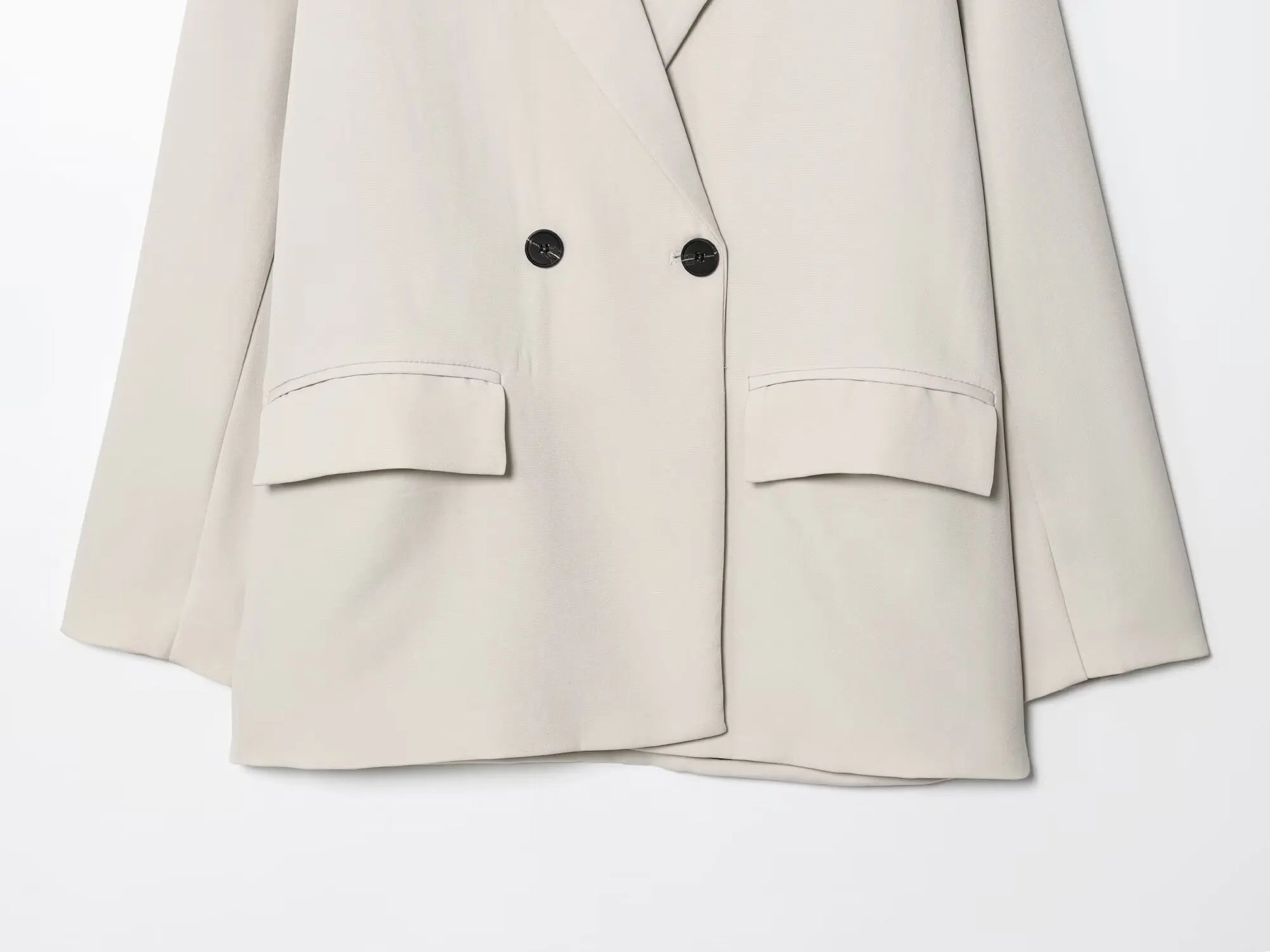 Redefine your work-to-weekend wardrobe with this sophisticated double-breasted blazer. Tailored for the modern woman, this jacket strikes the perfect balance between professional polish and casual cool. The classic notched lapel and structured straight cut offer a sharp silhouette that commands attention in the boardroom.