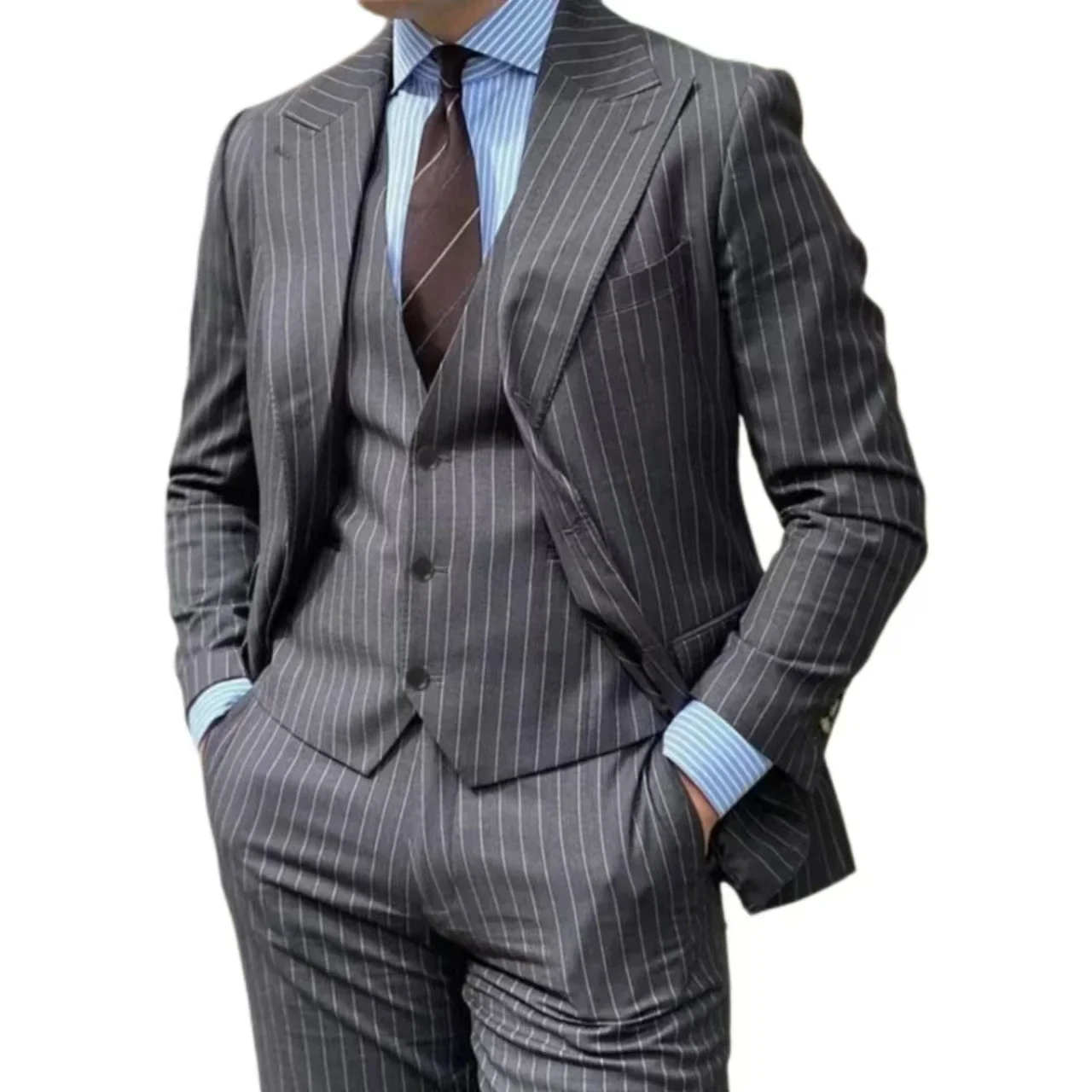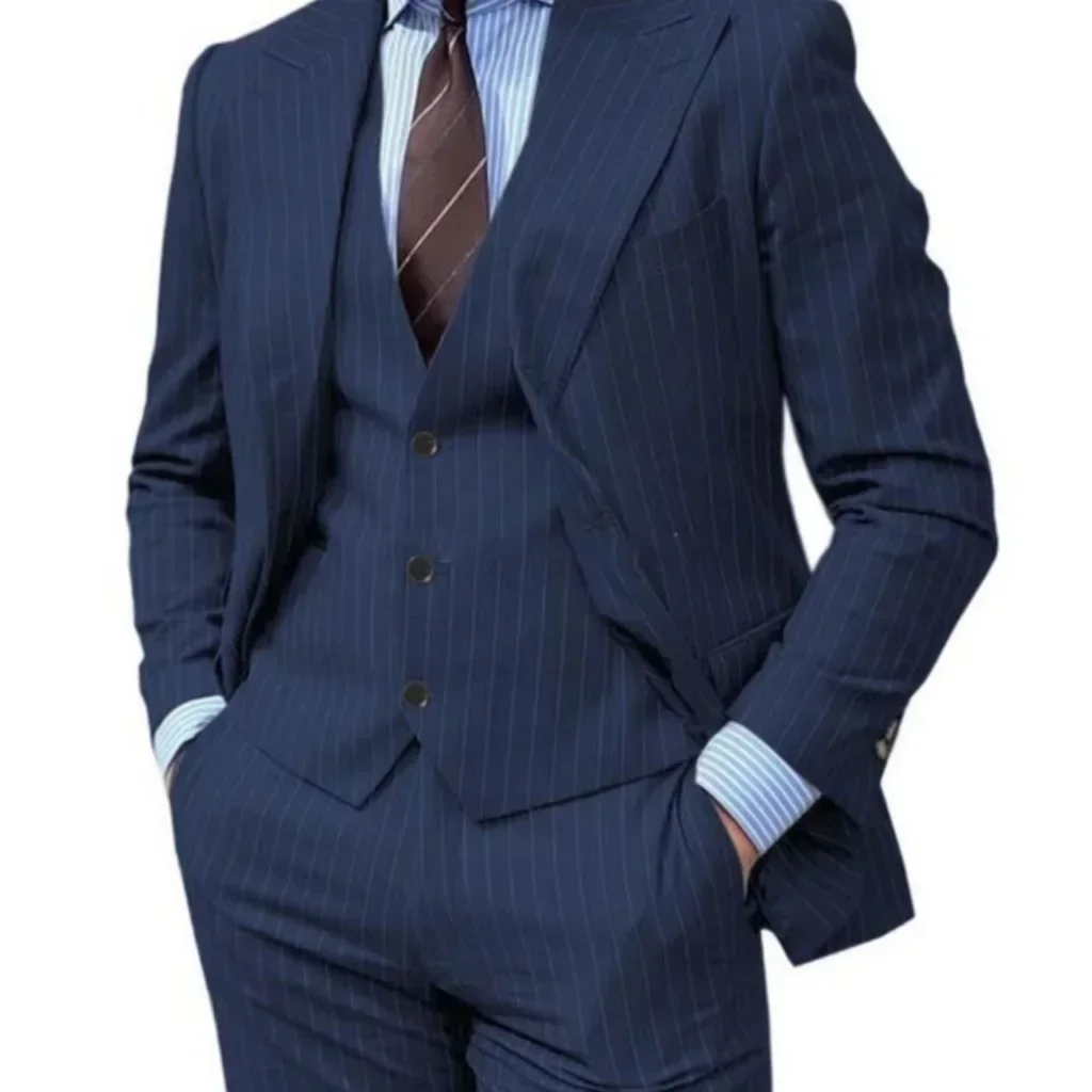 Refined, versatile, and tailored to perfection, the M&T Wear Three-Piece Striped Suit delivers a confident and sophisticated look for weddings, business meetings, or formal occasions. Its clean one-breasted design and subtle striped pattern strike the perfect balance between timeless elegance and modern style.